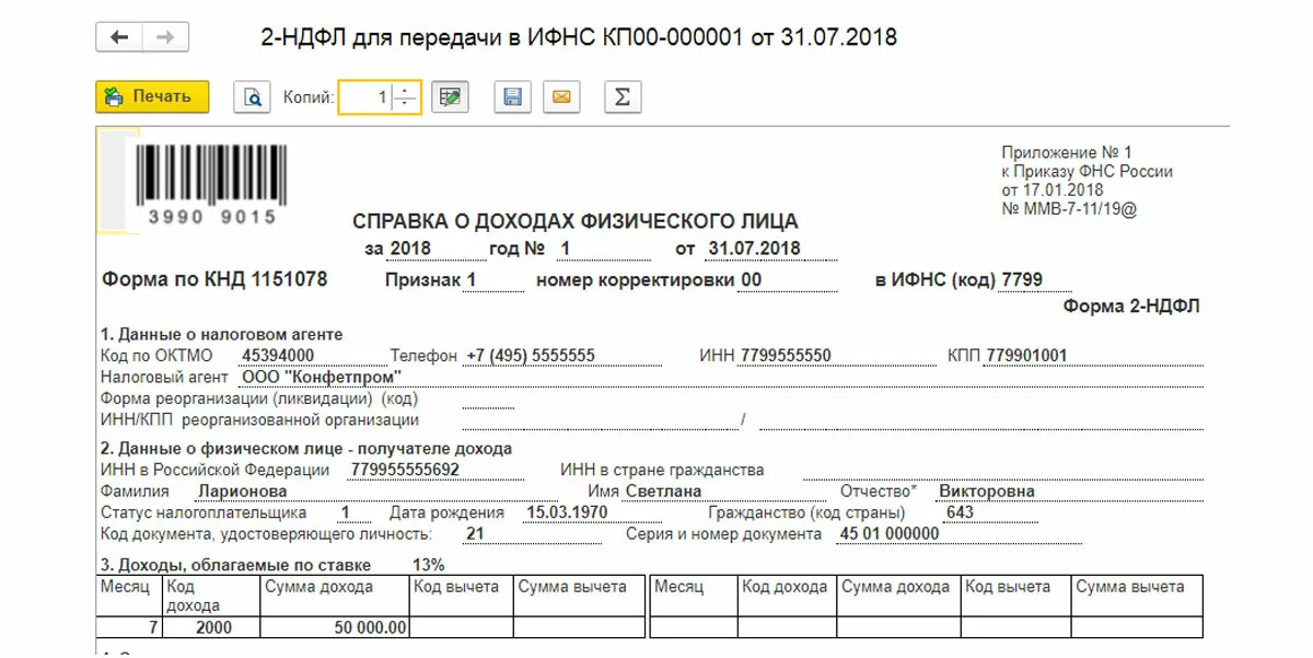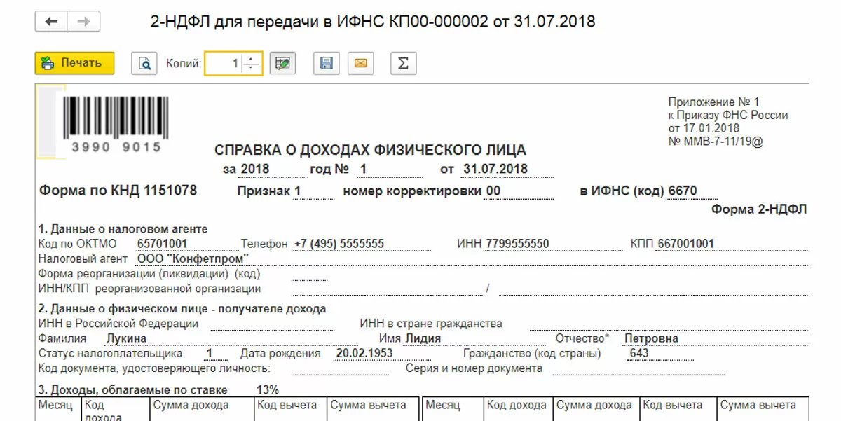 Далее нажимаем «Записать» и «Печать». Выводится на экран печатная форма справки. Проверяем данные, обращаем внимание на код ИФНС.