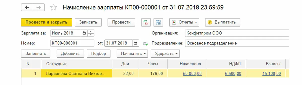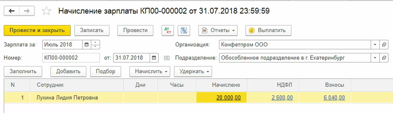 При помощи кнопки «Создать» начисляем заработную плату для сотрудников основного подразделения. Для примера возьмем данные по одному сотруднику. Заполним и проведем документ «Начисление зарплаты».