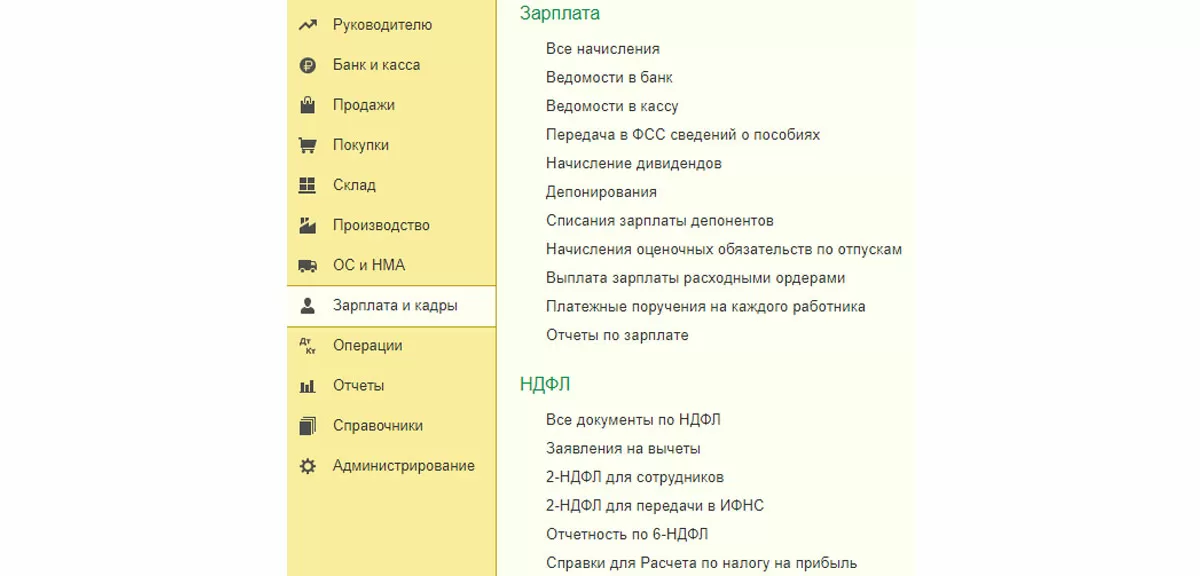 Итак, мы начислили заработную плату двум сотрудникам основного и обособленного подразделений. Далее сформируем справки 2-НДФЛ по этим сотрудникам. Для этого из главного меню заходим в «Зарплата и кадры – НДФЛ – 2-НДФЛ для передачи в ИФНС».