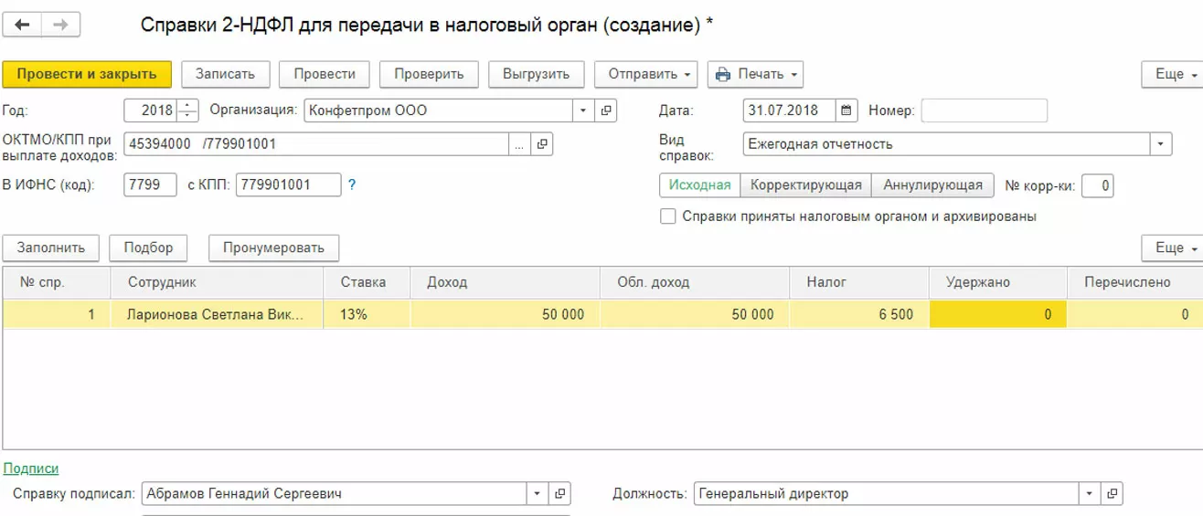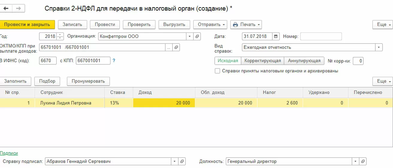 Создаем справку для сотрудника основного подразделения. Программа 1С 8.3 предлагает возможность выбрать налоговую инспекцию по ОКТМО и КПП. Выбираем нужную нам и заполняем остальные данные. Данные по сотруднику должны заполниться автоматом. В справке отображаются данные: