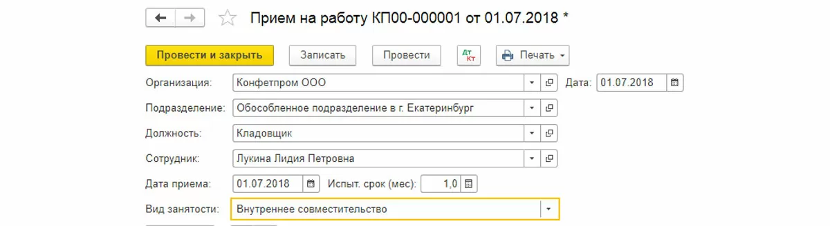 Через «Создать» заходим в документ приема на работу. Заполняем следующие сведения: