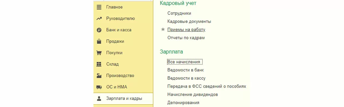 Для начала нужно принять на работу сотрудников в наше подразделение. Для этого заходим из главного меню в «Зарплата и кадры – Кадровый учет – Приемы на работу».