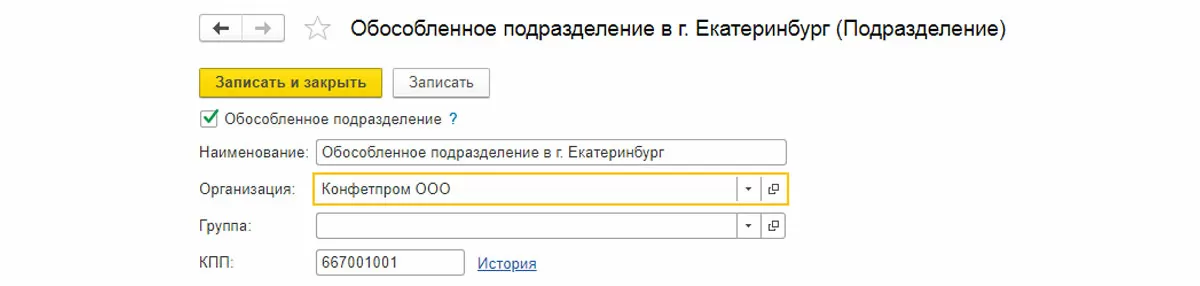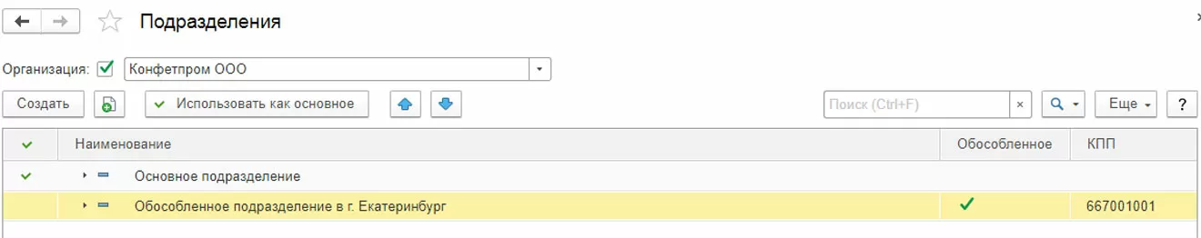 Нужно завести в 1С новое подразделение: ставим галочку «Обособленное подразделение», заполняем все реквизиты, указываем головное подразделение. КПП у подразделения будет свой, а ИНН у всех подразделений и головной фирмы – общий.