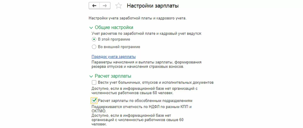 В разделе «Расчет зарплаты» ставим галочку «Расчет зарплаты по обособленным подразделениям».