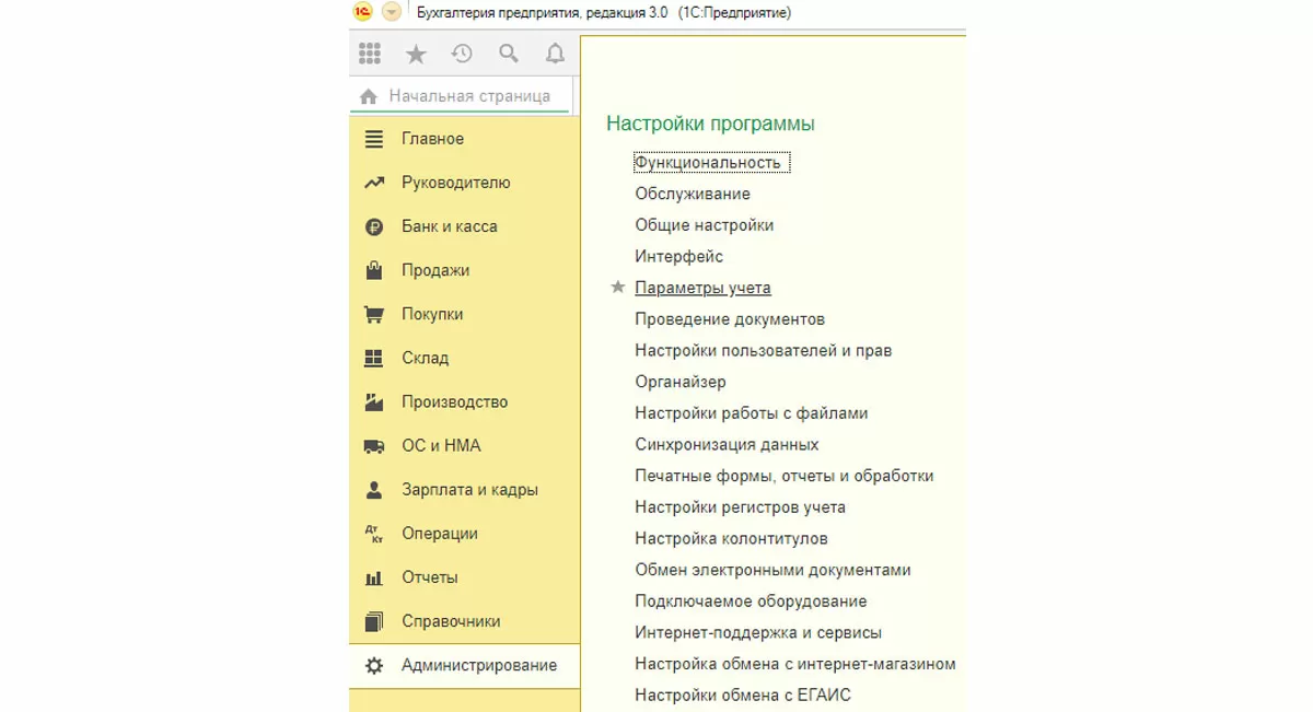 В главном меню выбираем «Администрирование – Настройка программы – Параметры учета».
