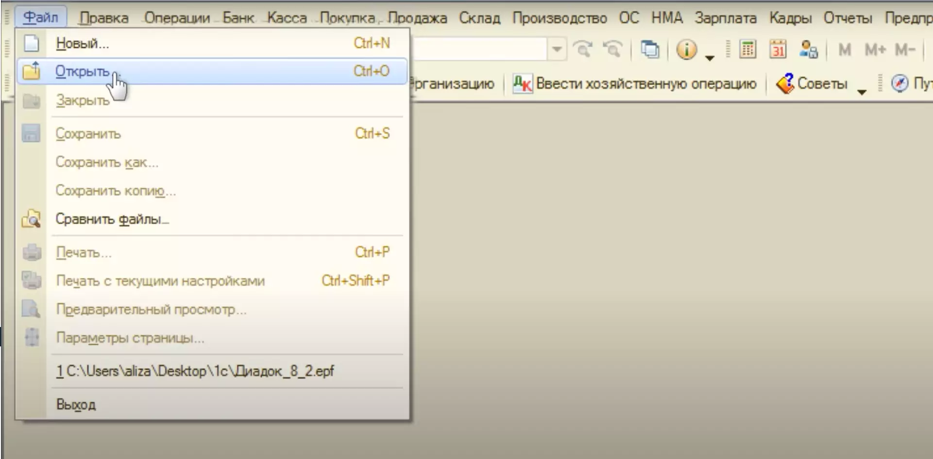 Открыть внешнюю обработку можно в режиме предприятия через команду Файл-Открыть.