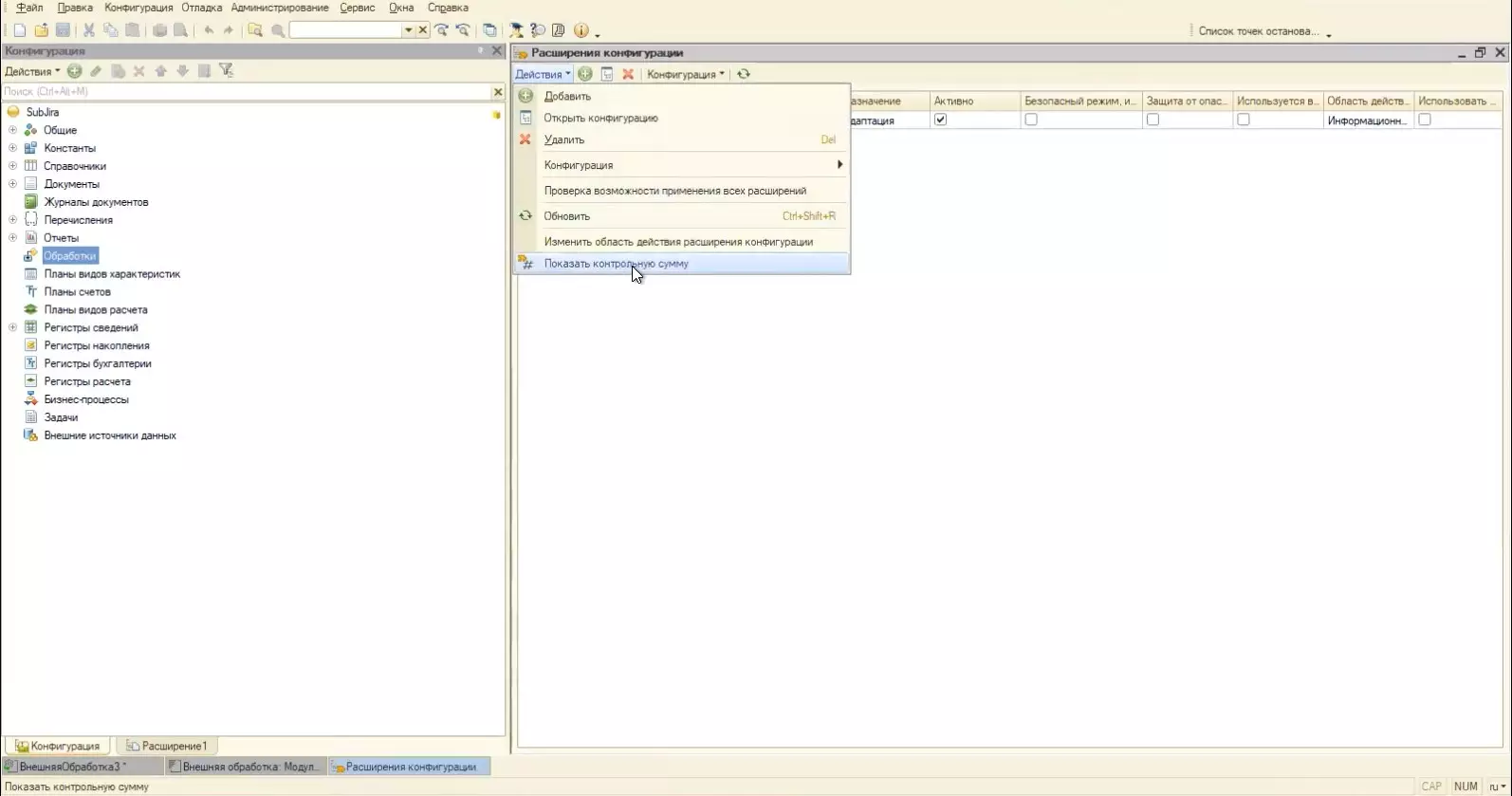 Если кто-то такую обработку перехватил и что-то добавил, то данную информацию проверить будет невозможно. Добавленный код может оказаться вредоносным. Во избежание получения «ломаных» обработок и расширений была придумана Хеш-сумма, контрольная сумма расширения (обработки) конфигурации.