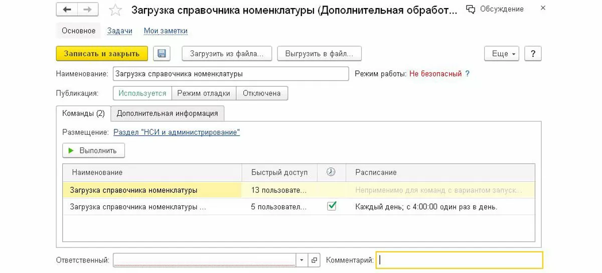 Для некоторых видов внешних обработок существует возможность задать пользователей, у которых в интерфейсе появится новая функция или расписание. Регламентные или фоновые задания – отдельный тип обработок, которые могут выполняться без участия пользователя. Это удобный функционал в тех случаях, когда нужно автоматизировать рутинную работу или чтобы запускалась групповая обработка 1С по документам. Также они могут помочь, если сервер слабый – все обработки можно запускать в вечернее время, когда активных пользователей в базе нет.