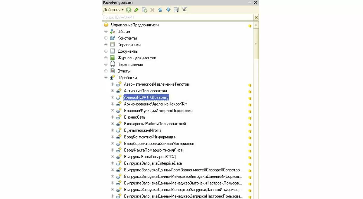 Чтобы узнать перечень обработок, подключенных к вашей конфигурации, необходимо зайти в нее в режиме конфигуратора. Нажмите на меню «Конфигурация» -> «Открыть конфигурацию». Слева откроется окно, в котором можно найти все объекты конфигурации, куда входят и встроенные обработки.