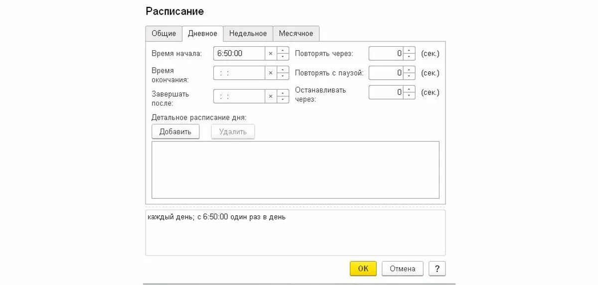 Настройка расписания в 1С богата вариантами, но даже неподготовленный пользователь сможет разобраться в принципах за несколько минут. В нижнем поле в зависимости от расставленных значений формируется описание распорядка, когда нужно запустить обработку и как она будет выполняться. Чтобы проверить правильность выполнения можно использовать журнал регистрации – в нем фиксируются дата и время начала и окончания обработки.