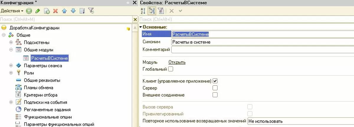 Справа откроются свойства добавленного общего модуля, и нам предстоит разобраться, что обозначает каждое из них. Они могут быть различной направленности, поэтому, перед тем как настраивать новый объект, желательно определиться, что мы там будем хранить. Если что, в будущем можно будет изменить свойства в соответствии с задачами: