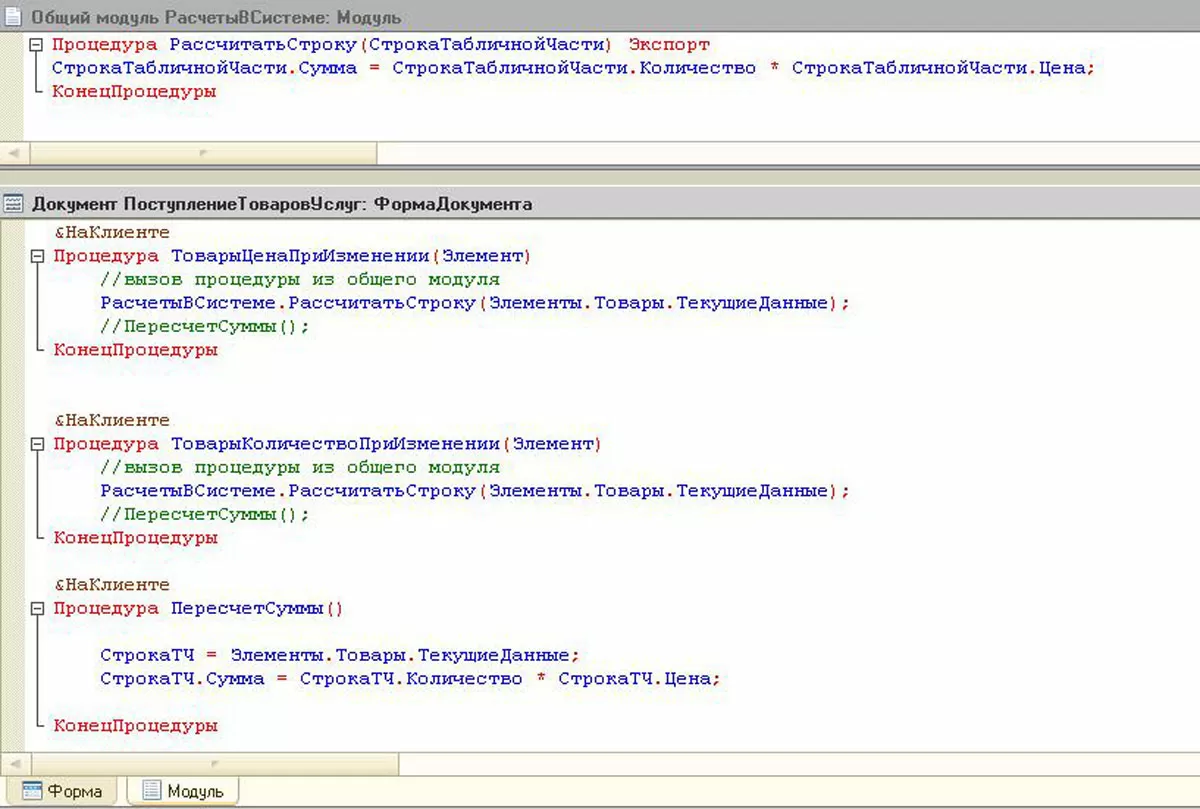 Создадим экспортную процедуру в модуле и перенесем туда алгоритм расчета суммы из процедуры в модуле формы. В качестве параметра процедуры на входе будет использоваться строка табличной части. В модуле формы документа меняем вызовы процедуры в том же модуле на вызов процедуры из общего модуля.