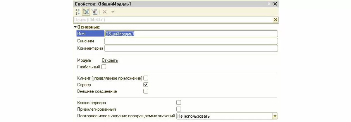 - «Повторное использование». Может принимать значения: «Не использовать», «На время сеанса», «На время вызова». При многократном вызове одной процедуры система может использовать рассчитанные ранее данные в рамках процедуры (вызов) или жизни всего сеанса (запуска 1С). Стоит быть очень осторожным с этой настройкой, так как из-за неправильного использования таких модулей могут возникать ошибки.