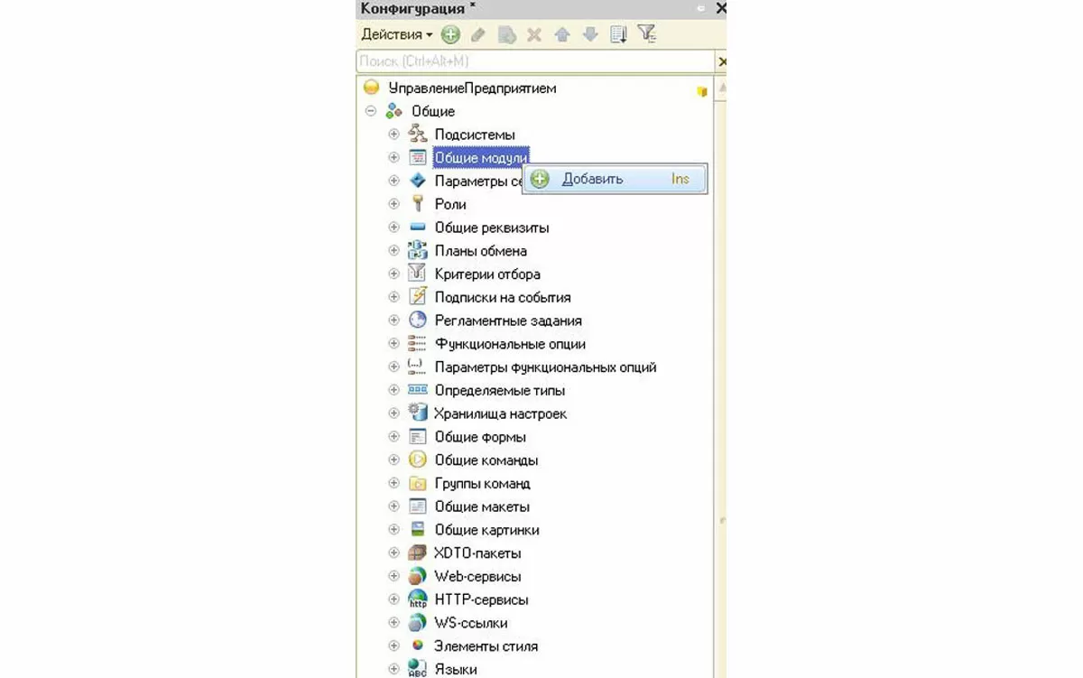 После создания функции в одном из модулей объекта возникла потребность использовать аналогичный алгоритм в другом месте. Самое правильно, что можно здесь сделать – перенести код в общий модуль, но перед этим необходимо создать его. Чтобы это сделать, нам нужно зайти в конфигуратор и в дереве конфигурации найти вкладку «Общие». Затем выделить «Общие модули» и воспользоваться кнопкой в виде белого плюса на зеленом кружке.