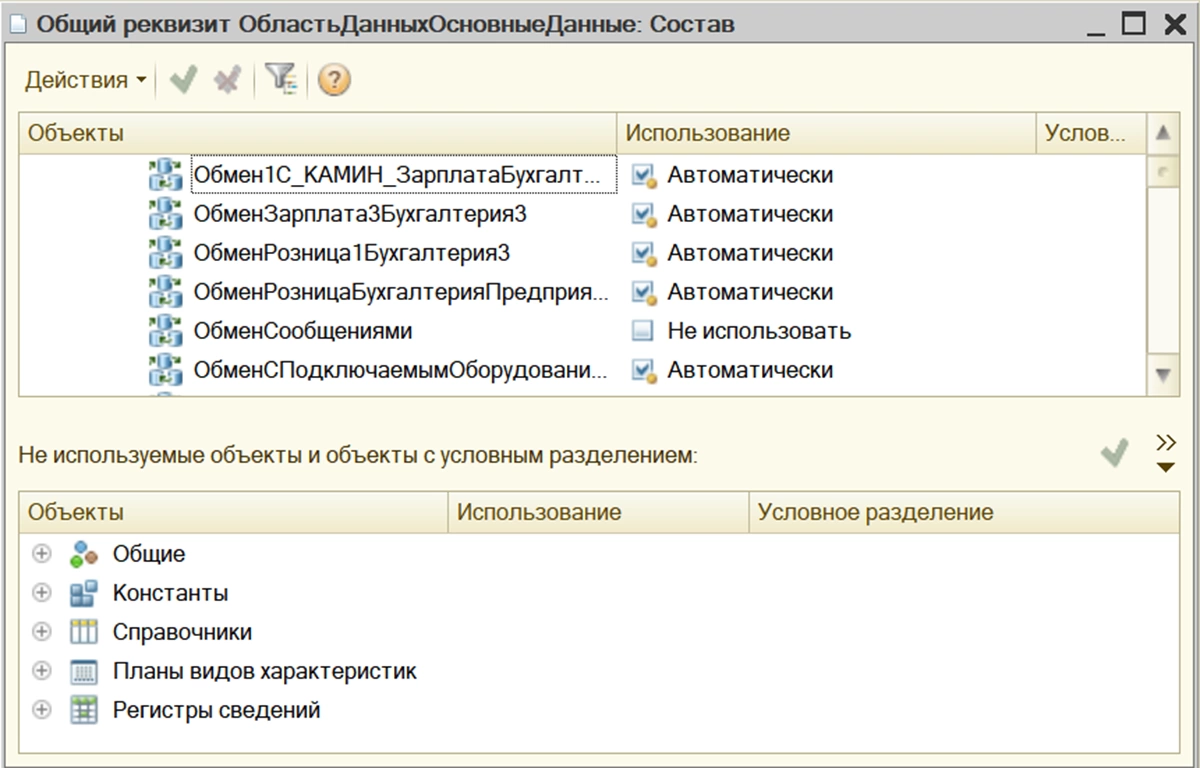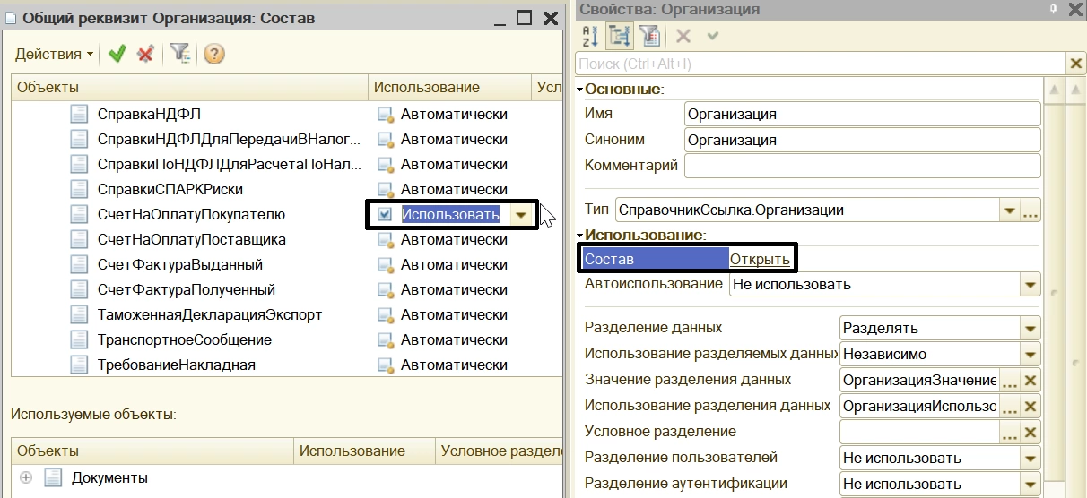 Нажав на гиперссылку «Открыть», мы увидим список объектов, где используется, а где нет, данный общий реквизит, а также где используется «Автоматически».