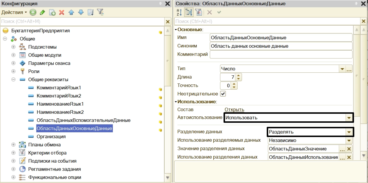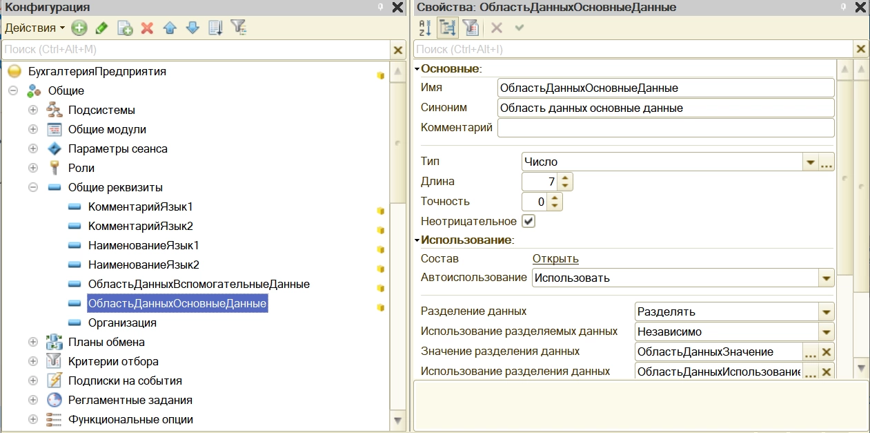 - Если в поле «Разделение данных» установлено «Не использовать», реквизит будет использоваться как входящий в состав нескольких объектов конфигурации. При установленном «Разделять», созданный разработчиком общий реквизит будет использоваться как разделитель данных.