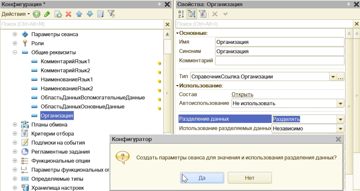 Поясним на примере. Предположим, у нас имеется общий реквизит «Организация». То есть он будет в каждом объекте. Указанием, что он будет разделителем, в базе сформируется несколько областей, в которых будут храниться сведения в разрезе этого разделителя. В приводимом примере – в разрезе организации. Таким образом, пользователь может поучать данные не только все, но и по определенной области данных – только по своей организации.