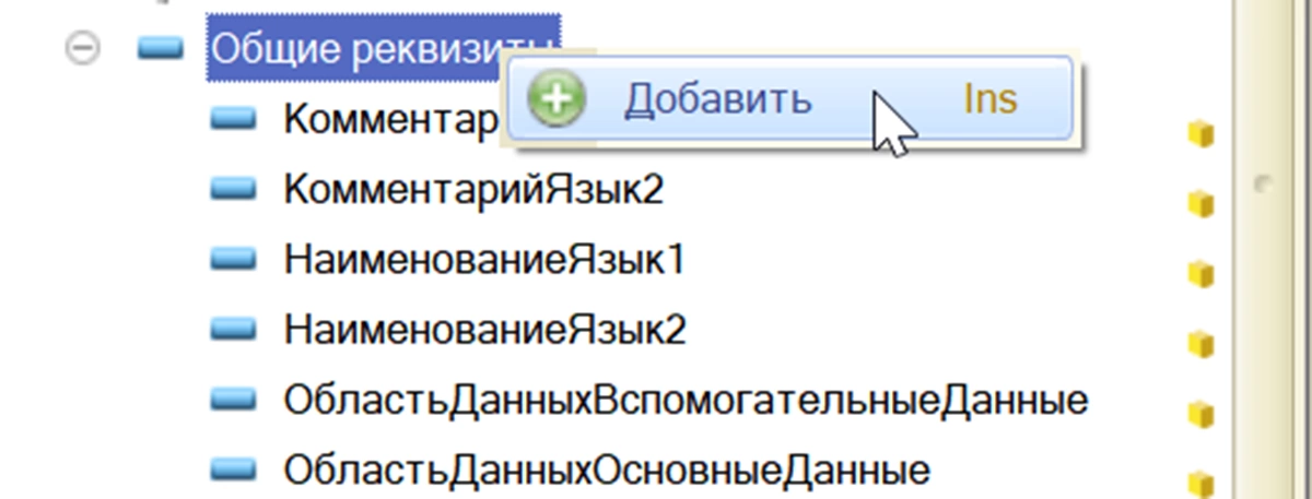 Для этого нажмем правой кнопкой мышки на общем реквизите и выберем команду «Добавить» или кнопка «Ins» на клавиатуре.