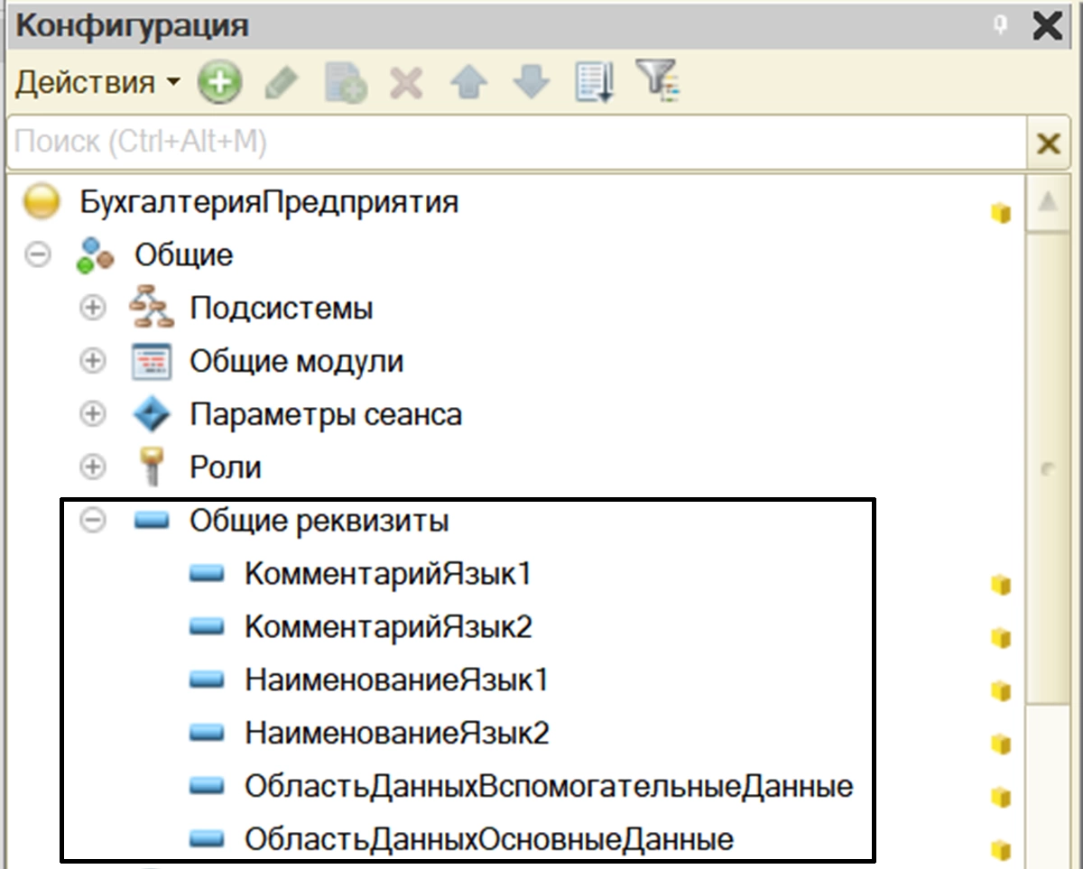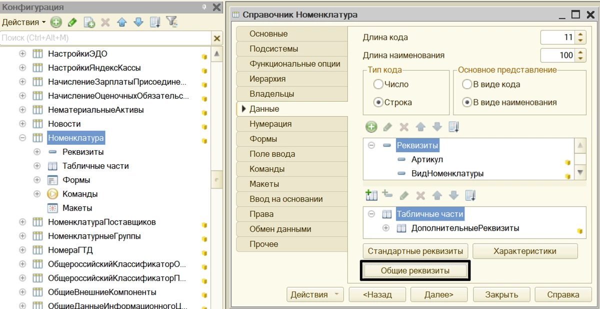 Если мы зайдем в программу 1С в режиме Конфигуратор и откроем дерево метаданных, то в разделе «Общие» увидим отдельную ветвь – «Общие реквизиты».