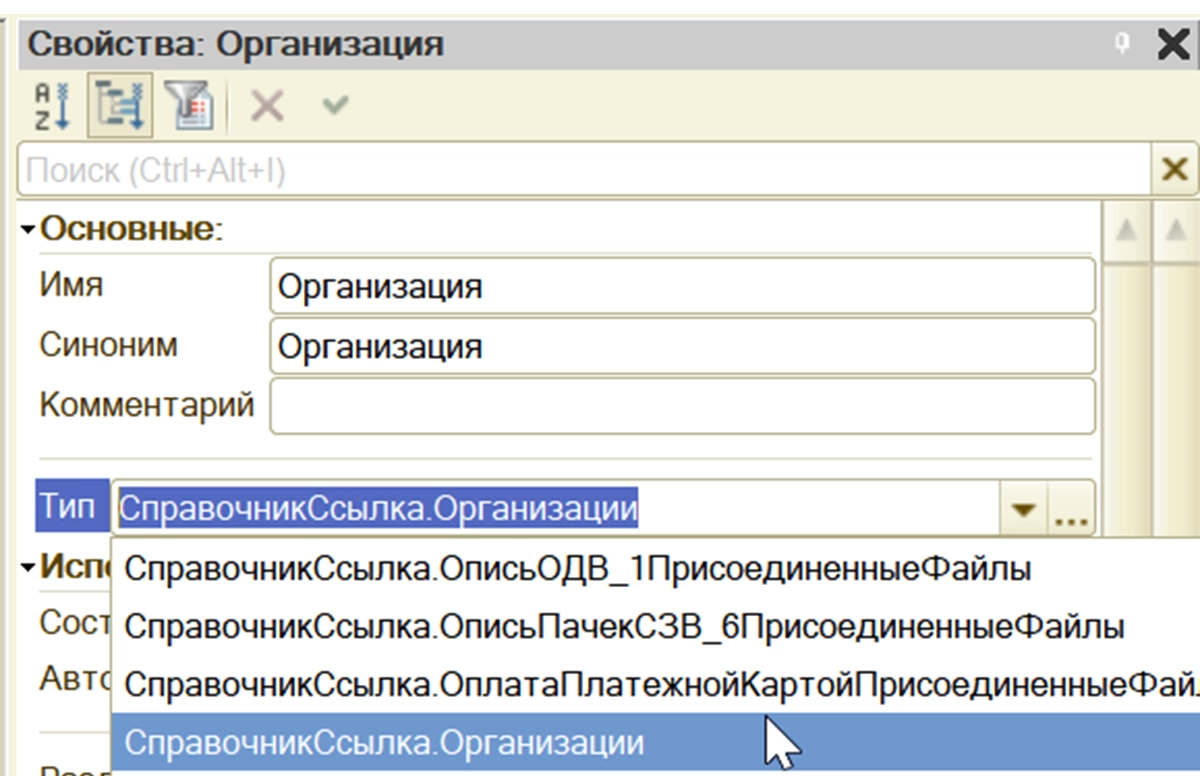 Для примера назовем его «Организация», соответственно тип укажем - СправочникСсылка.Организации.