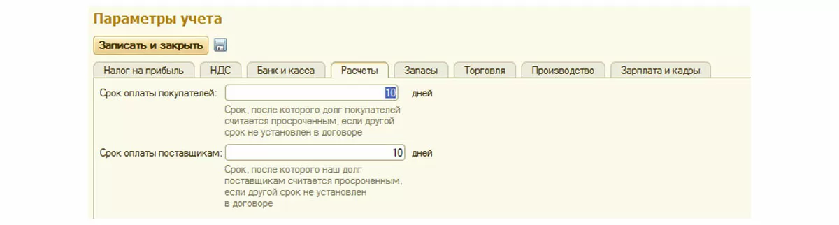 Для такого вида учета в системе необходимо произвести определенные настройки Параметров учета в разделе Настройки учета. Необходимо указать сроки оплаты покупателями и поставщикам. Также нужно учитывать, что если в условиях договора с контрагентом указан иной срок, то в системе будет учитываться срок из договора.