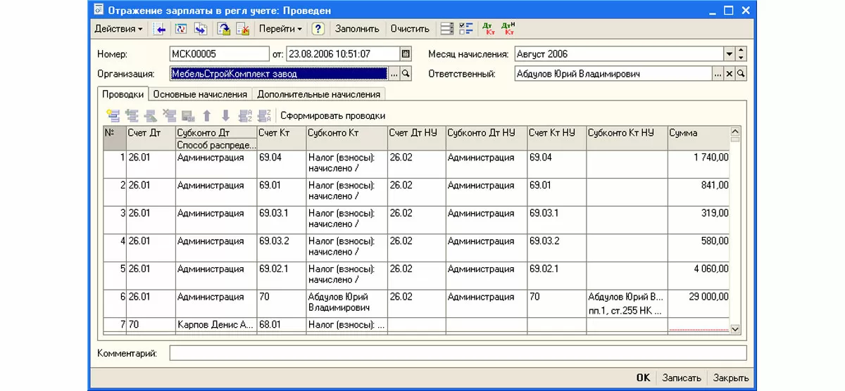 Для отображения обобщенной информации о начислениях и удержаниях в бухгалтерской базе используется документ «Отражение заработной платы в регламентированном учете». На основании этого документа формируются автоматические проводки. Бухгалтерские проводки, соответствующие сгенерированным системой проводкам, указываются в списке способов отражения зарплаты.