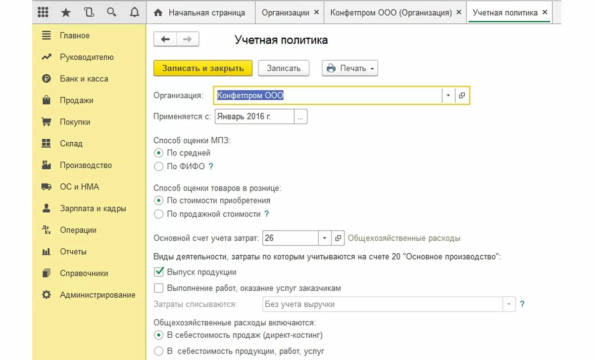 - Настраиваем учетную политику. В данном разделе необходимо указать раздел прямых затрат. Все затраты, которые не относятся к прямым, программа автоматически отнесет к косвенным.