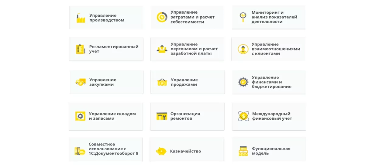 1С:ERP стала развитием 1С:УПП – первой комплексной системы 1С, вобрав в себя лучшие наработки, новейшие отечественные и международные практики автоматизации бизнеса, а также пожелания представителей заказчиков. Благодаря такому подходу к реализации со стороны разработчиков система получила наиболее востребованную и необходимую функциональность.