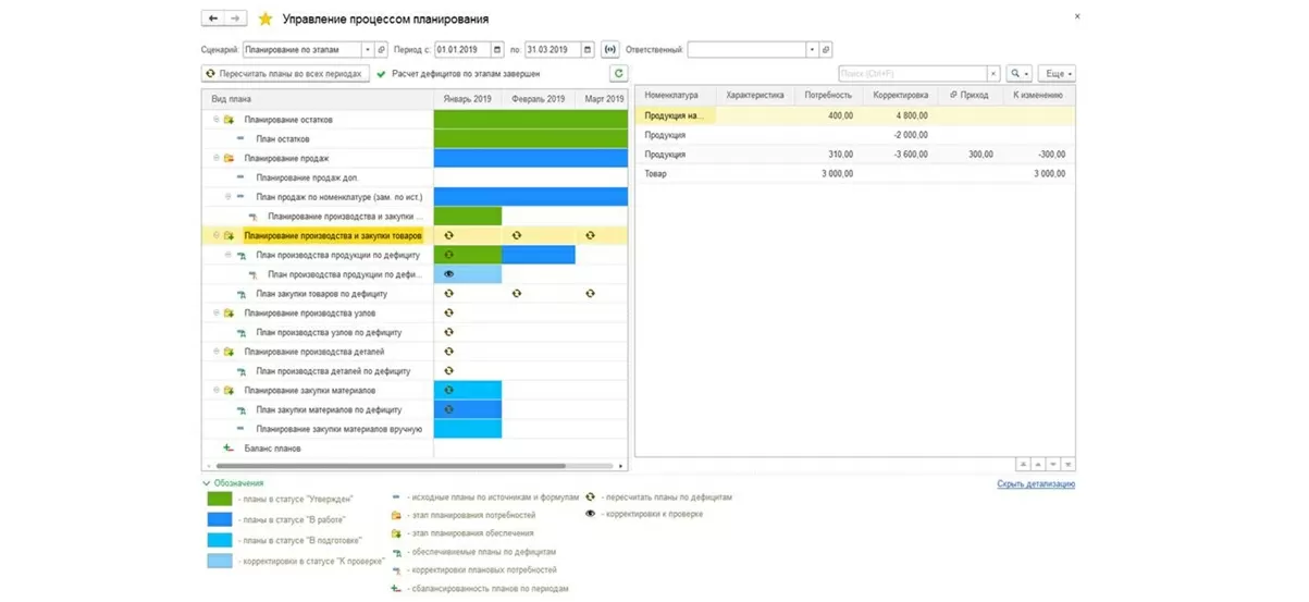 - Управление каскадным процессом планирования дает возможность быстро сбалансировать планы, составленные для разных участков и этапов производственного процесса.