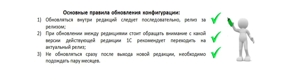 - Также на «простоту» обновления влияет и количество пропущенных релизов. Этот фактор достаточно важен, так как обновления системы должны происходит последовательно друг за другом. Так, например, если обновления не производились около года, или больше, то такое обновление может занять около 2-3 недель, опять же, в зависимости от степени доработанности системы относительно типового функционала.