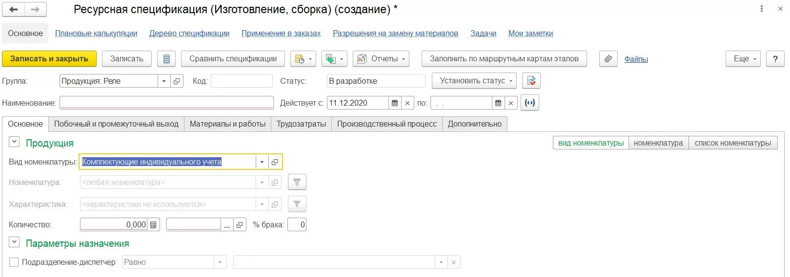 - Назначение общей спецификации для «Вида номенклатуры» ускоряет одновременную работу с большим количеством однородной номенклатуры.