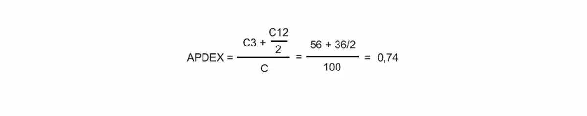 Данных, приведенных в таблице, достаточно, чтобы определить индекс APDEX для конкретной операции по простой формуле. Необходимо сложить количество операций, выполненных быстрее допустимого времени и половину количества итераций, выполненных в промежутке от 3 до 12 секунд. Разделить получившуюся сумму на общее количество операций и в результате получить индекс APDEX для конкретного действия.