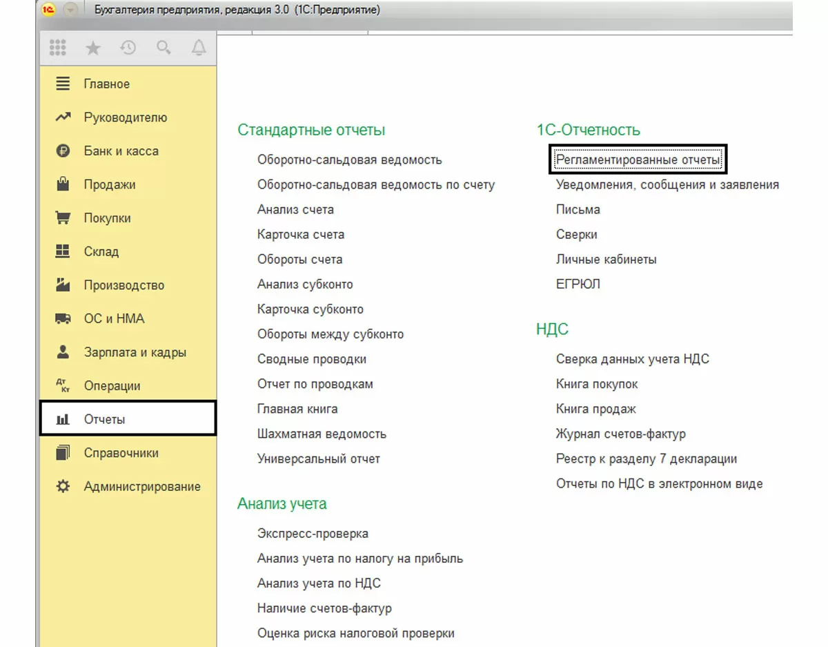 Откроем регламентированные отчеты - «Отчеты» - «1С - Отчетность» - «Регламентированные».