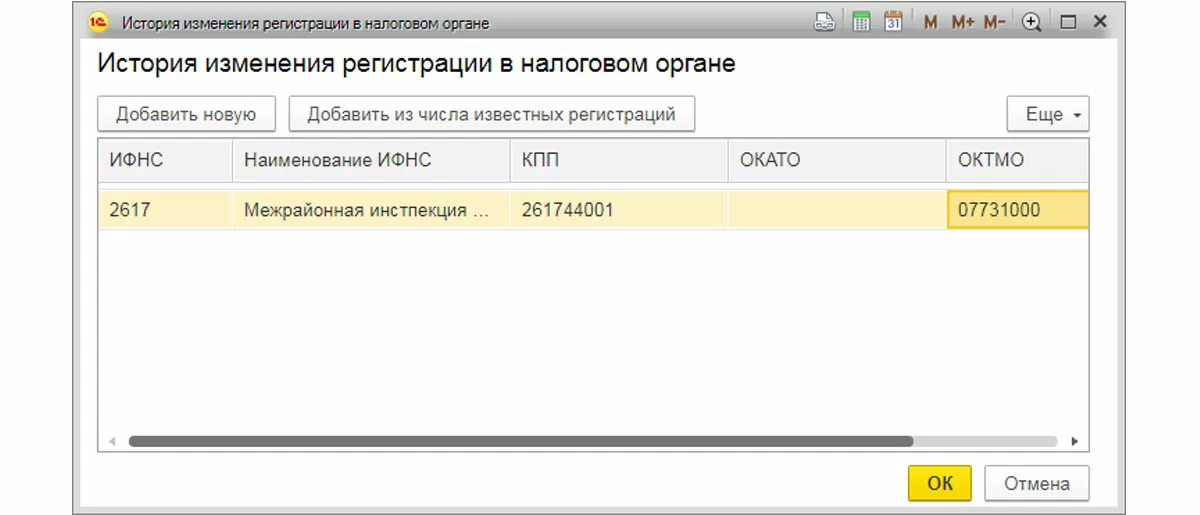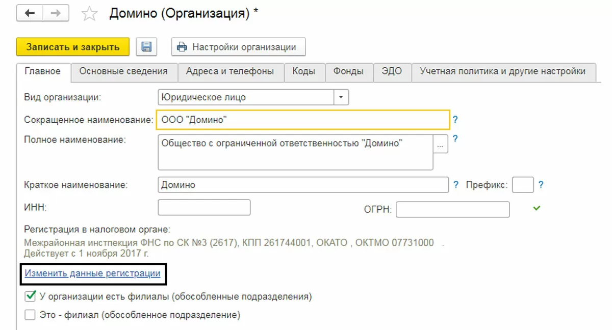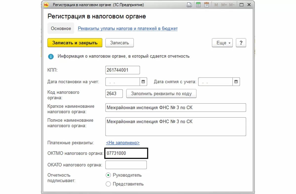И нам открывается такая же карточка «Регистрация в налоговом органе», как мы заполняли в «1С:Бухгалтерия 3.0».Здесь же мы видимо поле «ОКТМО налогового органа».