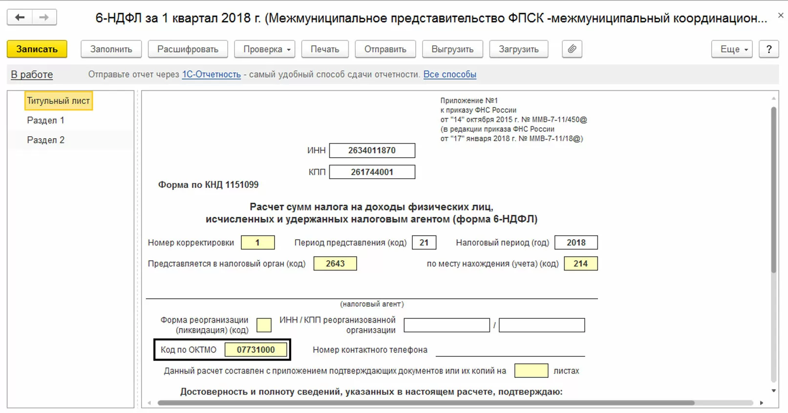 Выберем любой отчет (в нашем примере это 6-НДФЛ) и увидим, что там при заполнении проставляются все реквизиты, в том числе мы видим и ОКТМО.