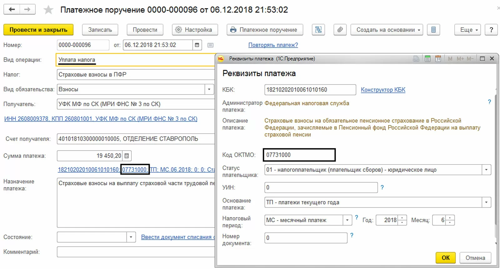 Рассмотрим, платежное поручение («Банк и касса» - «Платежные поручения»). При выборе вида операции «Уплата налога» и выборе в качестве получателя МРИ ФНС, поля для налоговых платежей заполняются автоматически. В том числе мы видим и наш ОКТМО, в строке в виде гиперссылки, вместе с КБК платежа и другими реквизитами.
