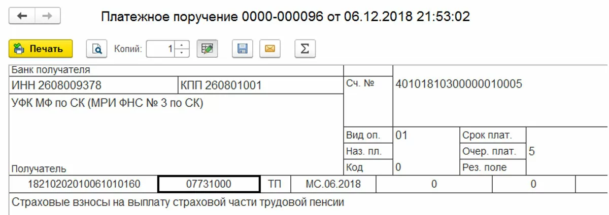 При выводе на печать формы «Платежного поручения» мы видим заполненный ОКТМО в поле реквизитов «Получатель».