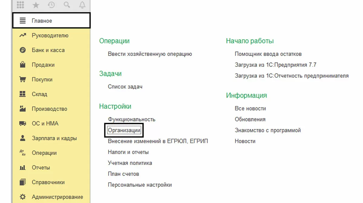 Реквизит ОКТМО заполняется пользователем вместе с остальными данными в карточке организации. Перейдем в раздел меню «Главное» - «Организации».