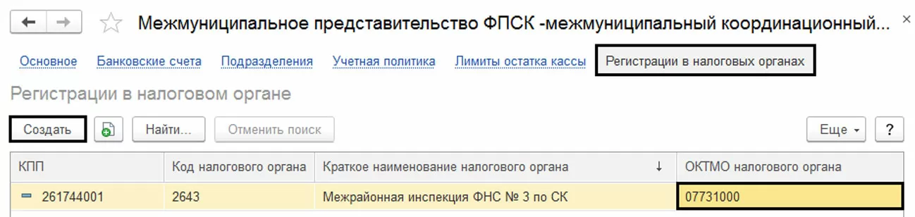 Откроем данные нашей организации и перейдем по гиперссылке в верхней части окна - «Регистрация в налоговых органах». Нажав кнопку «Создать», в открывшемся окне заполняем регистрационные данные в налоговой инспекции.