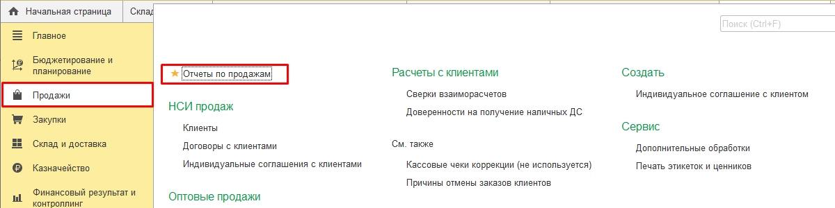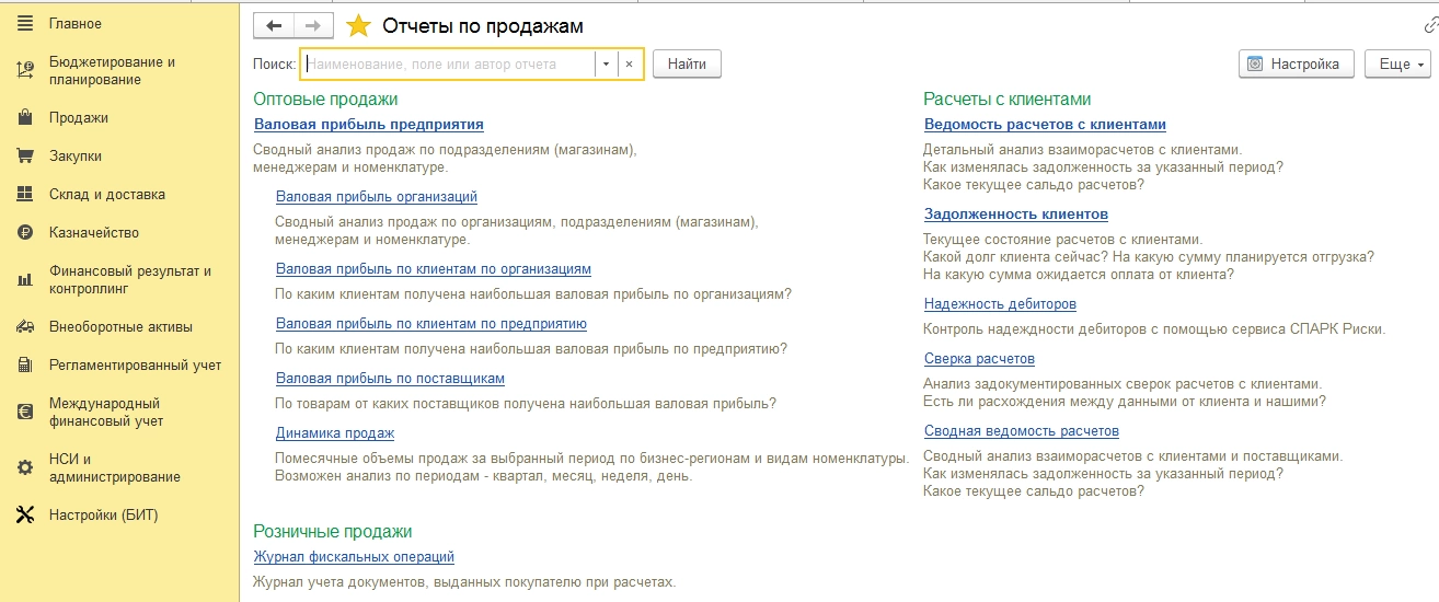 Поговорим о менеджерах нижнего и среднего звена, которые, как правило, отвечают за узкий участок работ и анализируют данные деятельности предприятия, используя небольшой набор отчетов. Для этих целей практически в каждой подсистеме 1С:ERP (продажи, закупки, маркетинг) выделен отдельный подраздел с отчетами по текущему блоку.
