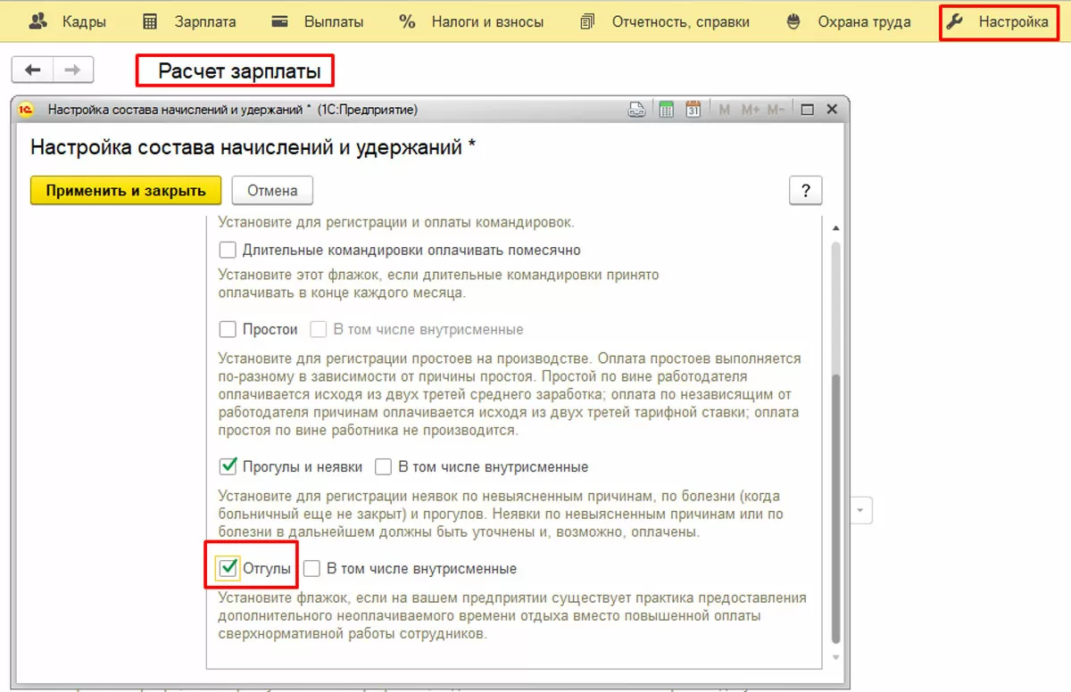 Включить данную возможность можно в разделе «Настройка» - «Расчет зарплаты» - «Учет отсутствий» - «Отгулы».