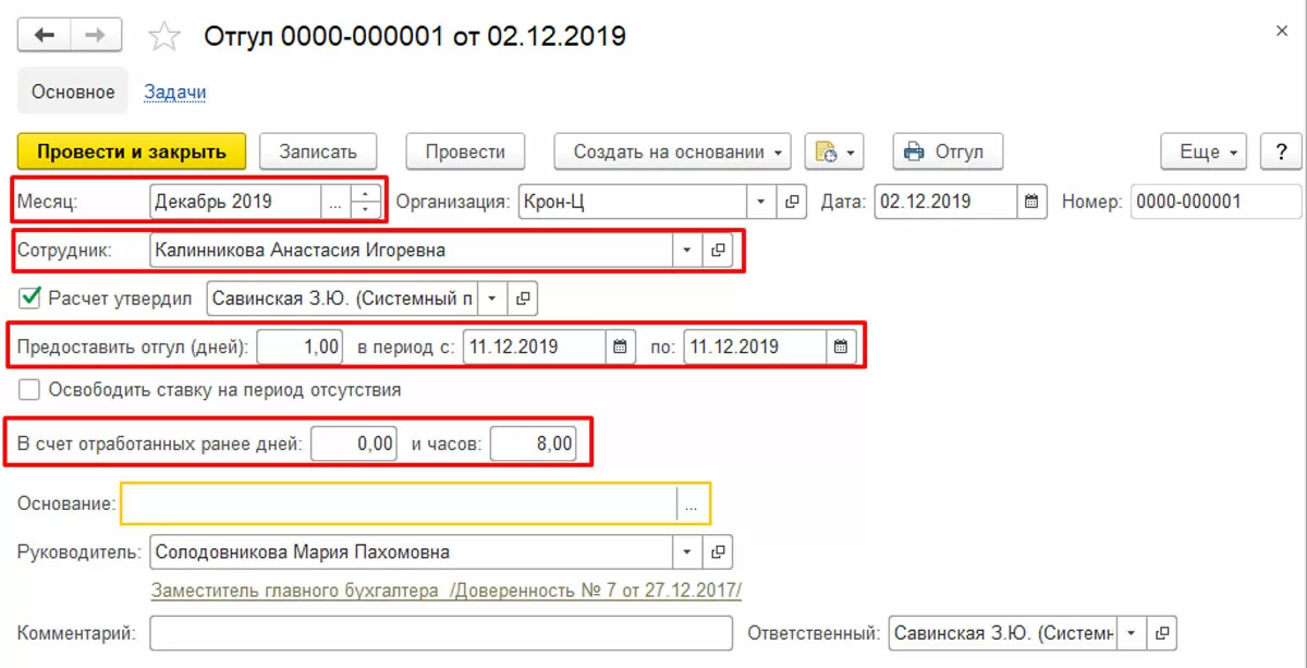 Зайдя туда, указываем самого сотрудника, месяц, когда он хочет взять отгул и количество дней отгула, а также в какой период он будет работнику предоставлен.