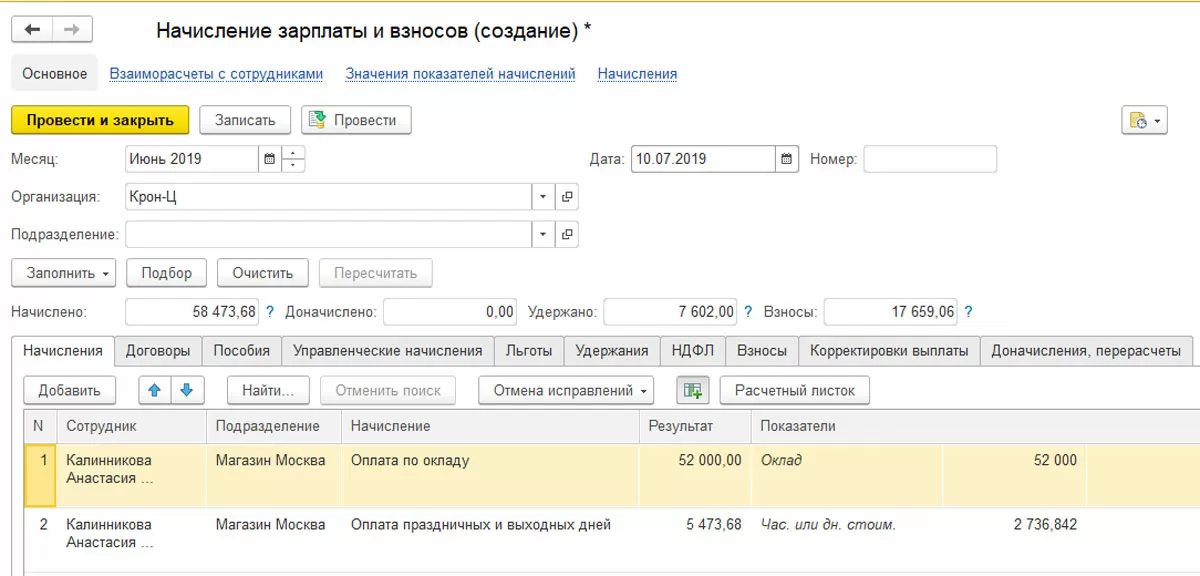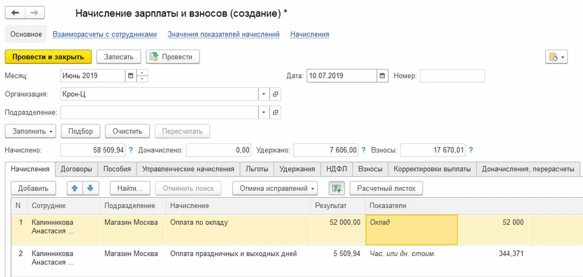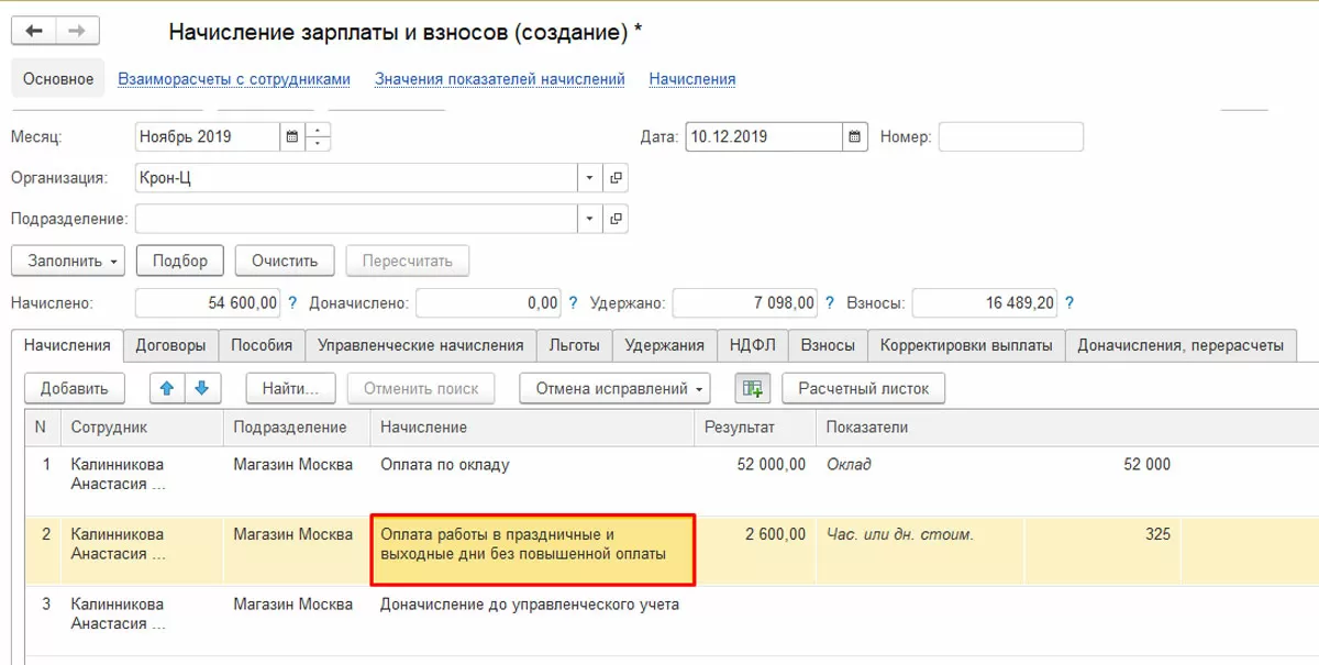 В документе начисления отобразится соответствующий вид расчета без повышенной оплаты, то есть в однократном объеме.
