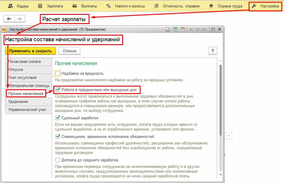 Сопровождение оплаты работы в праздничные и выходные дни от экспертов 1С:ЗУППраздничные в 1С ЗУП 8.3 рассчитываются сообразно настройкам расчета совокупной тарифной ставки (СТС). Виды начислений, которые входят в ее расчет, подбираются в «Настройках-Расчет заработной платы». Здесь же устанавливается количество часов, которое будет использоваться при перерасчете оклада в часовую ставку тарифа.