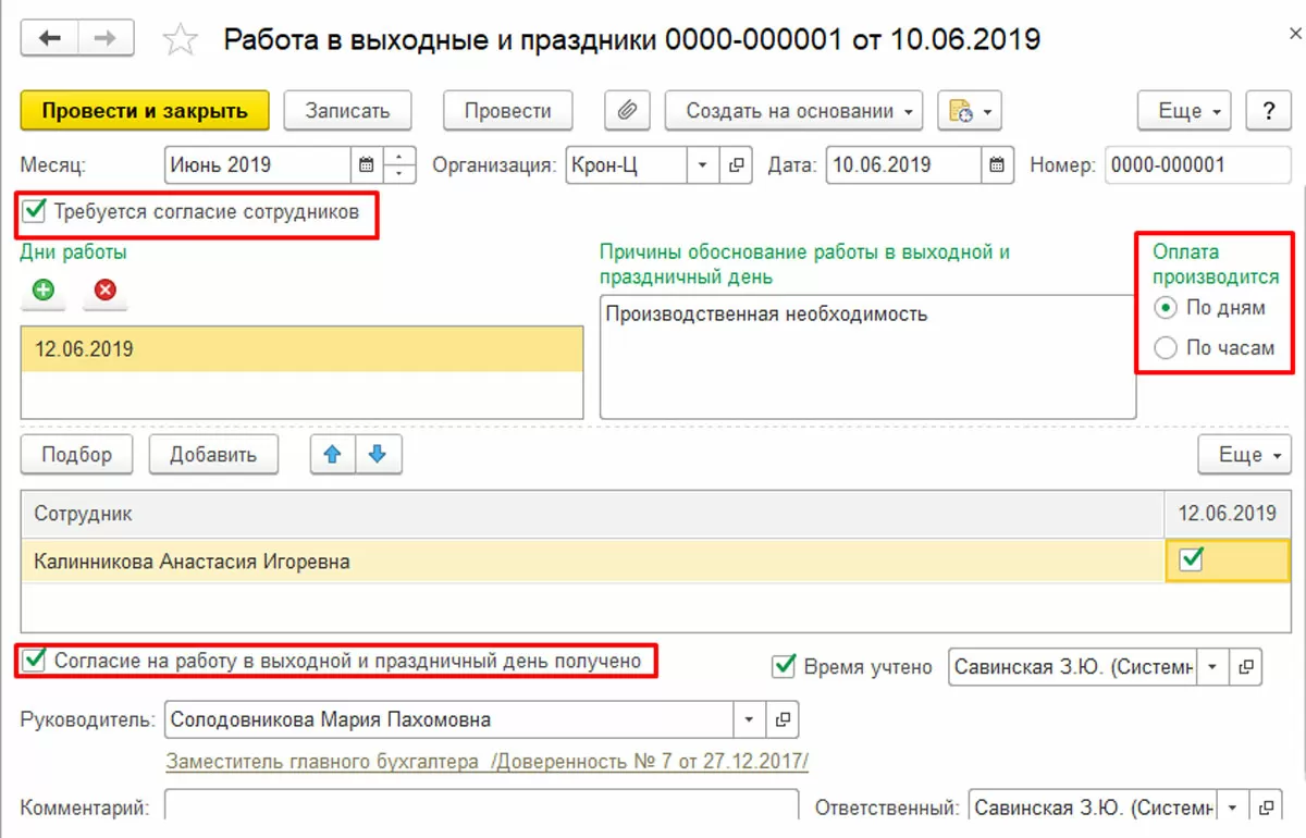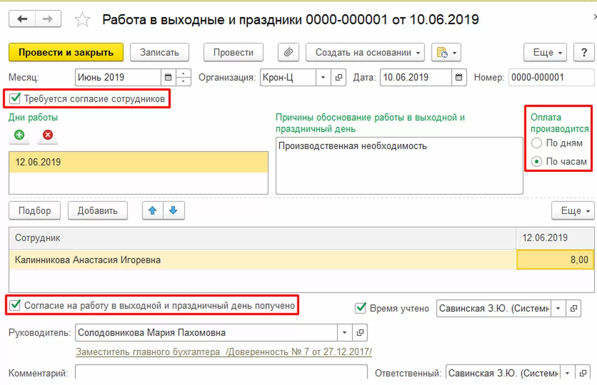 Теперь посмотрим, как правильно должна быть отображена работа в выходные дни в 1С, если работающий выходит вне своего графика в выходной или праздник, предварительно подтвердив это письменным согласием.