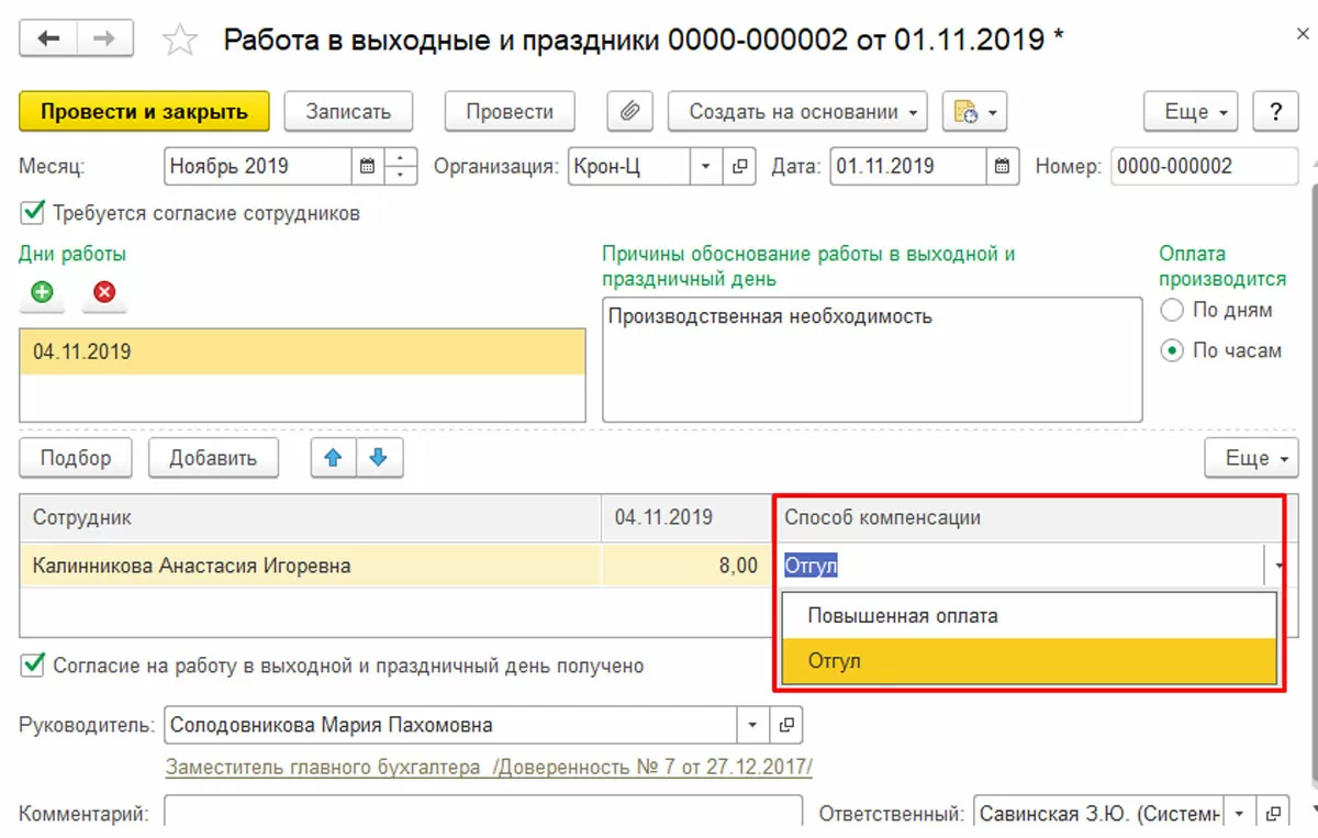 Проставление этой галочки приведет к тому, что в том же документе «Работа в выходные и праздники» возникнет поле выбора компенсации – в виде повышенной оплаты или отгула. Поскольку первый вариант мы уже рассмотрели выше, выберем «Отгул».