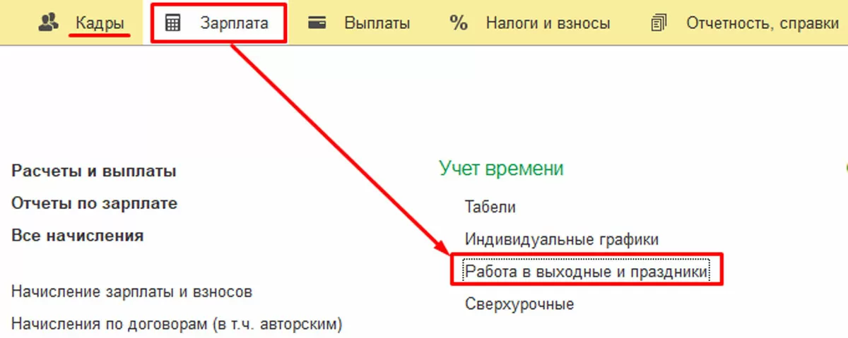 Чтобы фиксировать сам факт такого выхода, нужно создать документ «Работа в выходные и праздники» или из раздела «Кадры», или из раздела «Зарплата».