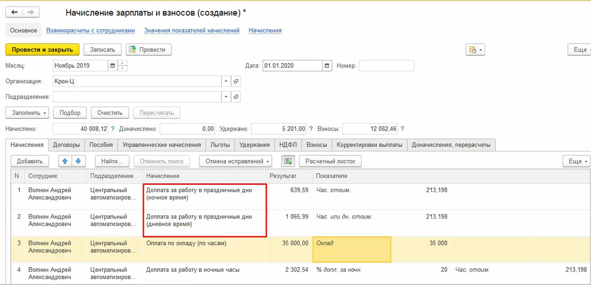 В ЗУП 8.3 никаких дополнительных документов для данной доплаты создавать не нужно, доначисления за праздник автоматом отобразится в «Начислении зарплаты и взносов». В созданной форме мы увидим 2 дополнительных начисления, разбитых за дневное и ночное время.