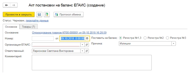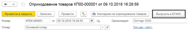 Обратите внимание, в некоторых случаях может понадобиться отразить приход алкогольной продукции и отправить данные в систему ЕГАИС, для чего в нашем документе есть кнопка «Выгрузить в ЕГАИС», откуда формируется «Акт постановки на баланс ЕГАИС».