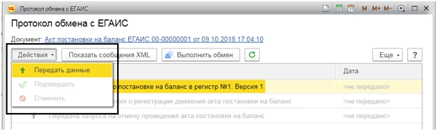 Сформированный документ ЕГАИС проводится по нажатию «Протокол обмена», а отправляются по нажатию на «Передать данные».